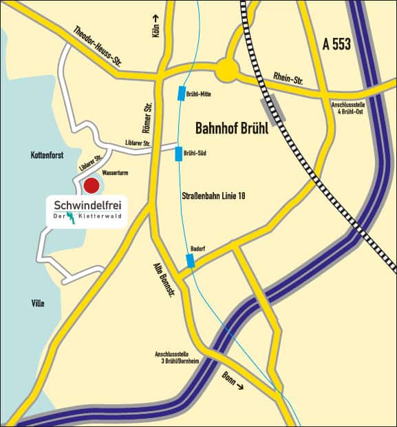 Linie 18 bis „Brühl Mitte“ oder „Brühl Süd“ (ca. 20 Minuten Fußweg)